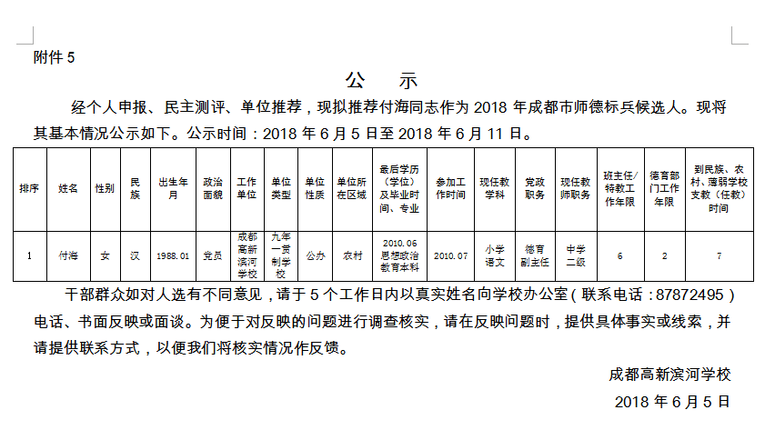 关于推荐付海同志为2018年成都市师德标兵候选人的公示