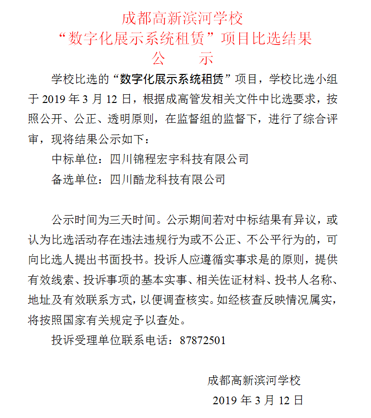 成都高新滨河学校 “数字化展示系统租赁”项目比选结果