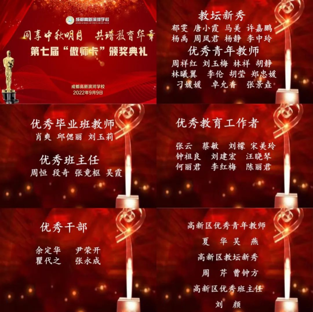 匠心致传承,笔墨写春秋,碧瓦黄墙间已然桃李芬芳。平凡的日子,闪亮的人生,为表彰优秀教师,激励广大教师坚守初心、深耕教育,2022年9月9日,成都高新滨河学校举行“同享中秋明月 共谱教育华章”——第七届“傲师卡”颁奖典礼暨中秋节线上庆祝活动,颁奖典礼由滨河学校办公室副主任肖爽主持。