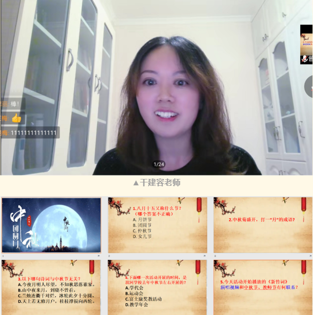 双会场,共庆祝。当中秋节遇上教师节,一切都是那么美好和圆满,今年的“傲师卡”盛典,特地开设中秋节活动分会场,干建容老师带领老师们走进五道趣味试题,由易到难,由诗词联系生活,由憧憬校园到育人初心的坚守。