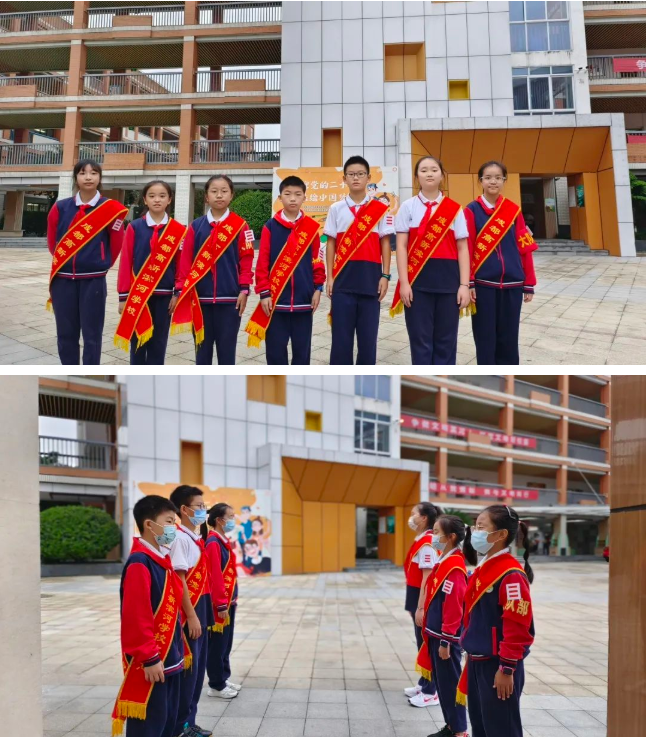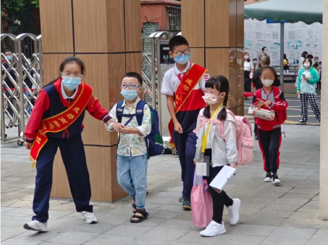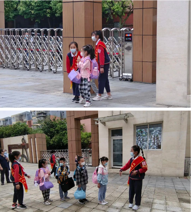 虽说离开了爸爸妈妈的护送,但是进入校园,学校大队部的哥哥姐姐们已经整装待发,做好带领新生萌宝们进入新班级的准备。他们或主动询问,或亲切指导,或积极整队,或亲自领路,帮助滨河萌宝们迅速适应开学新生活。