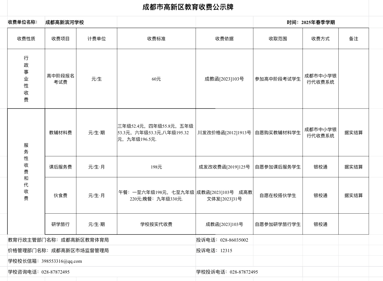 2025年春季成都高新滨河学校收费公示