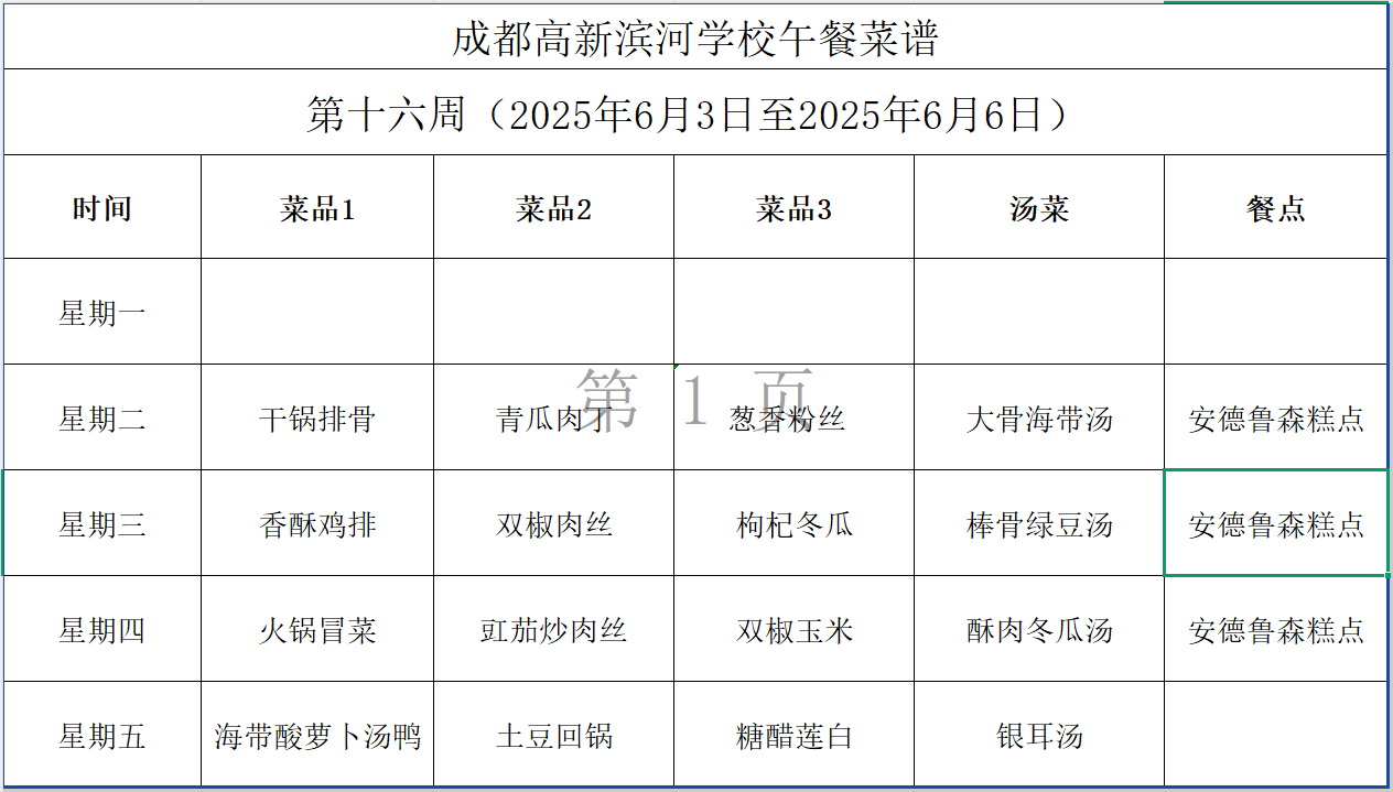 成都高新滨河学校午餐菜谱(第16周)